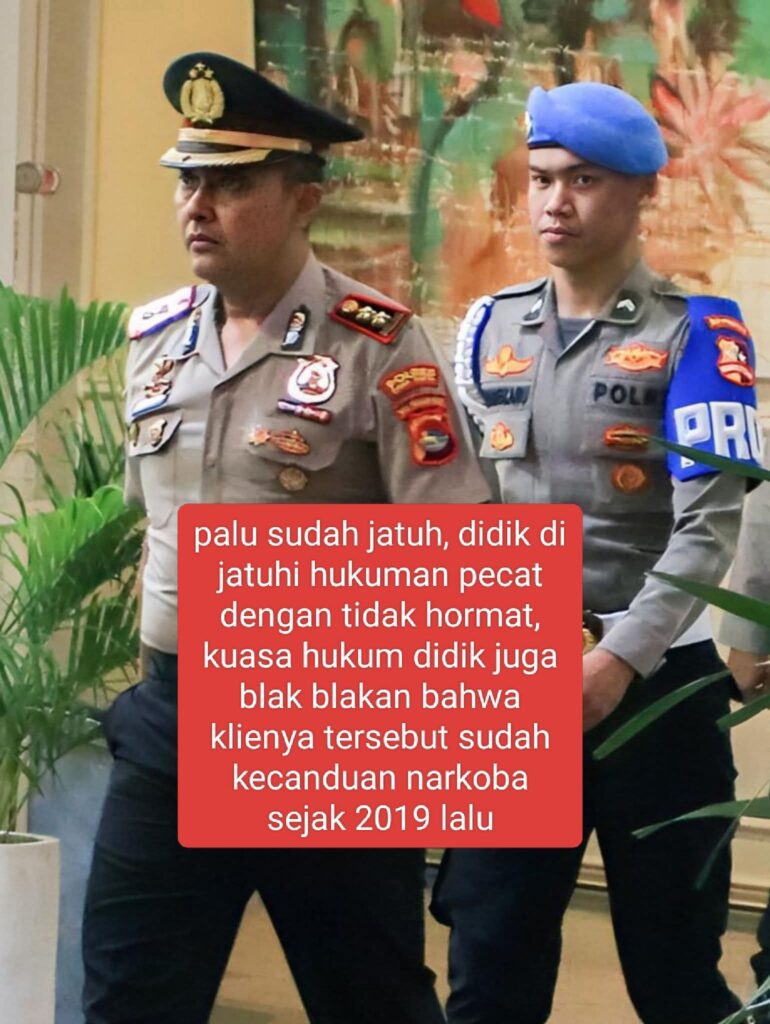 JAKARTA, BRANINEWS.ID-Hasil keputusan sidang etik yang digelar Komisi Kode Etik Polri mengungkap Didik melanggar kode etik Polri karena diduga terlibat penyalahgunaan narkotika dan melakukan kegiatan penyimpangan dalam kegiatan sosial asusila.