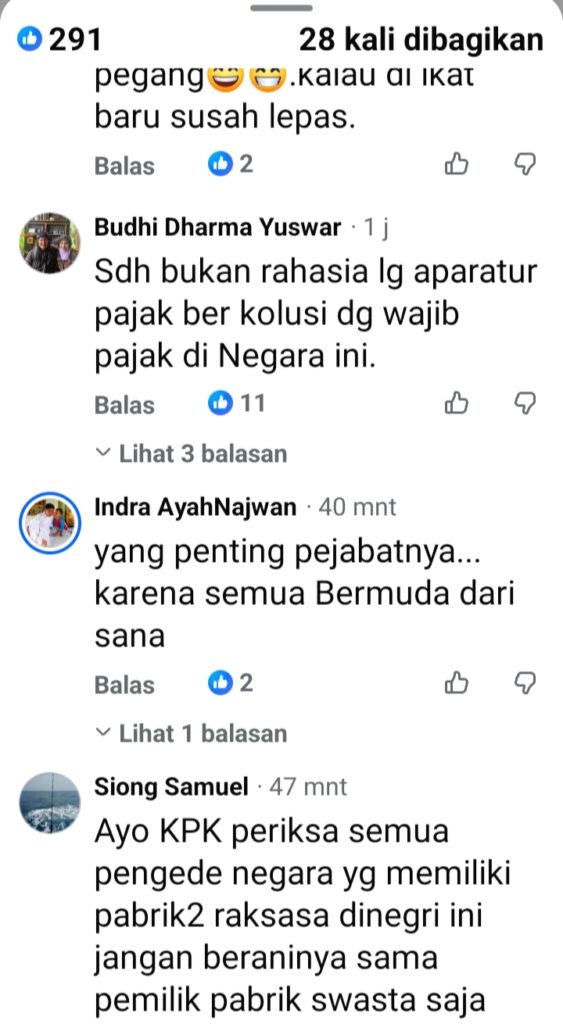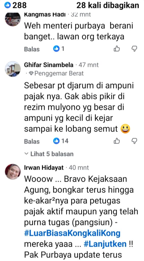Bahkan berita yg beredar dan viral media sosial maya itu , menyulut banyak berbagai komentar dari para warganet di dunia maya hingga memuji muji nyali menteri keuangan Purbaya Yudhi yang mengungkap korupsi pajak klas kakap.(DBM/STG/EDT)