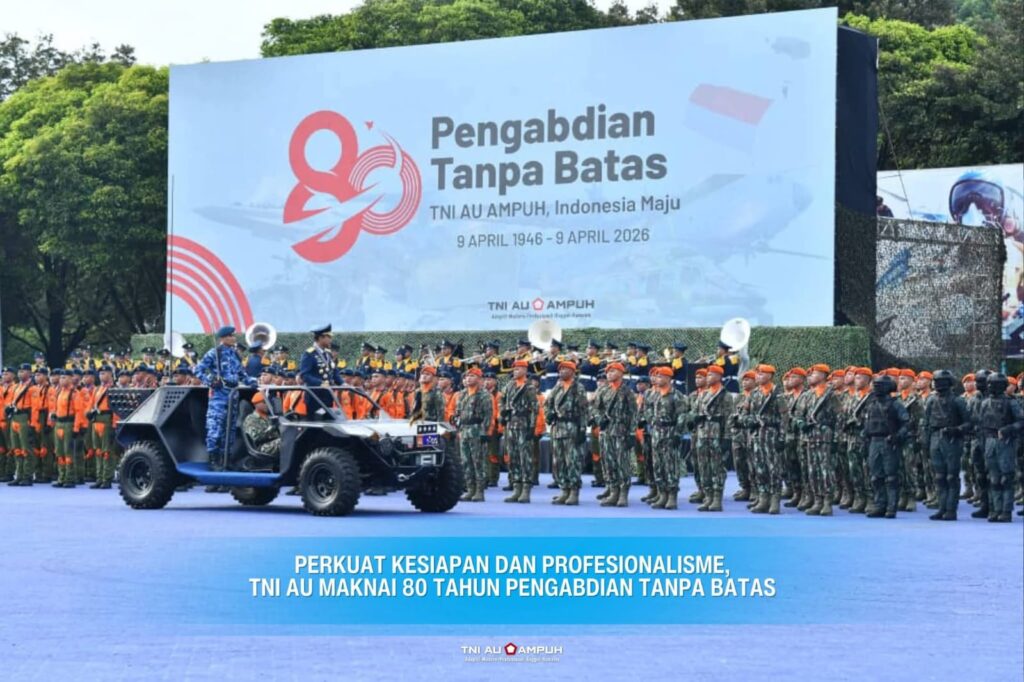 BRANINEWS.ID–Delapan dekade pengabdian tanpa batas menjadi perjalanan panjang TNI Angkatan Udara yang dibangun melalui karya nyata. Hal tersebut disampaikan Kasau, Marsekal TNI M. Tonny Harjono, S.E., M.M., saat memimpin upacara peringatan HUT ke-80 TNI AU di Lapangan Apel Mabesau, Cilangkap, Jakarta Timur, Kamis (9/4/2026).