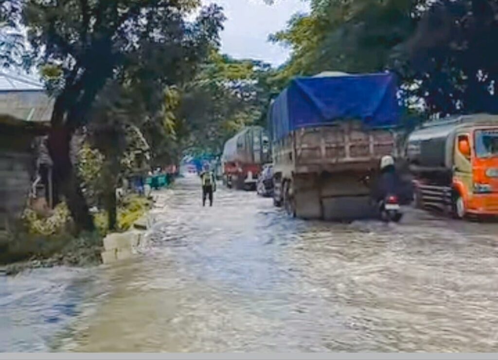 Sepanjang kurang lebih 100 meter dengan kedalaman air di jalan utama nasional itu mencapai 15–30 sentimeter , menyebabkan arus lalu lintas tersendat.